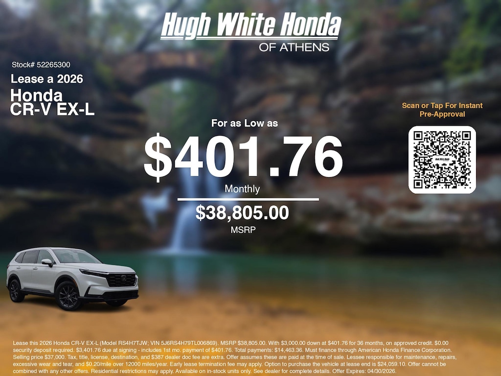If you're ready to lease a new Honda near Athens, Nelsonville, Logan, and Parkersburg, Hugh White Honda of Athens is thrilled to offer you a competitive lease offer on this 2026 Honda CR-V EX-L. Here is how the monthly payment of $401.76 is calculated for well qualified buyers shopping Hugh White Honda of Athens with Tier 1 credit:
