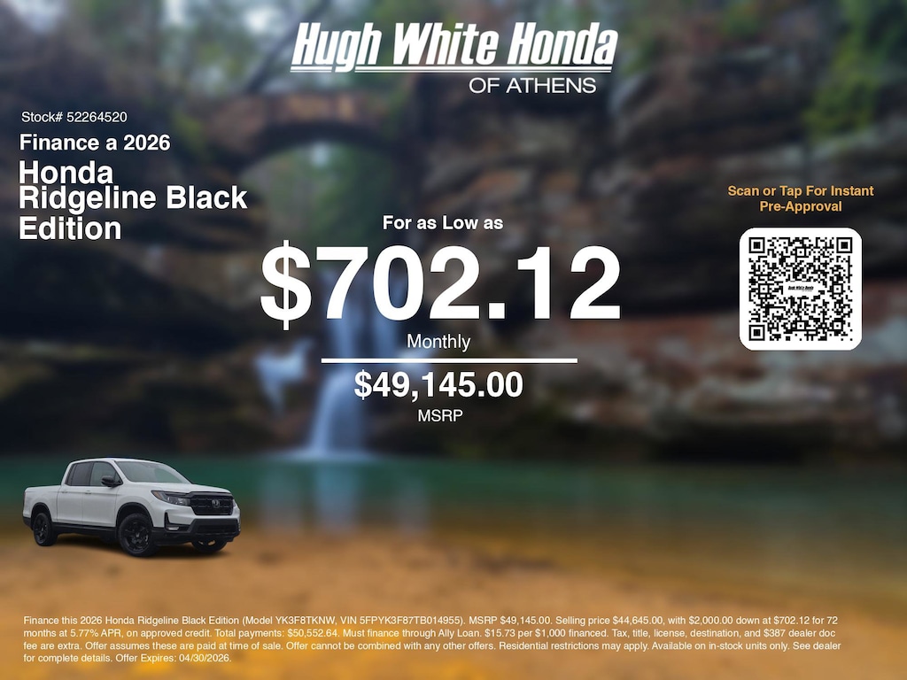 Calculate car payment options using our car monthly payment calculator to explore this and other Honda finance offers that leverage the benefits of Honda Financial Services, along with current Honda Ridgeline Black Edition specials and incentives available. Our car payment estimator can help you budget for your perfect vehicle. Plus, we have 3 other Ridgeline Black Edition options for Athens's best selection. Call or visit us today to discuss car payment options that allow you to drive home this stunning 2026 Honda Ridgeline, with finance options available near Athens. These Honda finance specials end 4/30/2026
