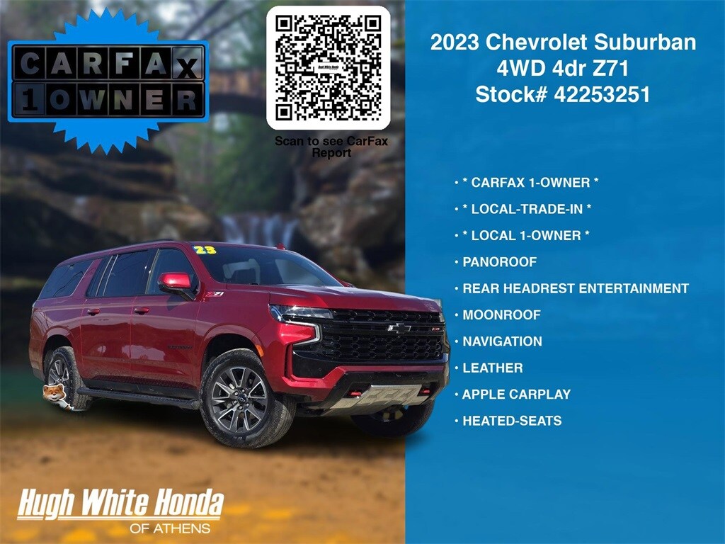 2023 Chevrolet Suburban Z71 Radiant Red Tintcoat CARFAX One-Owner. 10-Way Power Driver & Passenger Seat Adjusters, 1st & 2nd Row Color-Keyed Carpeted Floor Mats, 2-Speed Active Electronic AutoTrac Transfer Case, 2nd Row Pwr Release 60/40 Split-Folding Bench Seat, 3rd Row 60/40 Power-Folding Split-Bench, Auto-Dimming Inside Rear-View Mirror, Black Tubular Assist Steps, Bose 9-Speaker Stereo Audio System Feature, Bright Front & Rear Door Sill Plates, Color-Keyed Carpeting Floor Covering, Driver & Front Outboard Passenger Airbags, Driver Alert Package, Enhanced Driver Information Center, Floor Console w/Storage Area, Front High-Approach Angle Fascia, Hands-Free Rear Power Programmable Liftgate, HD Surround Vision, Heated 2nd Row Outboard Seats, Heated Driver & Front Passenger Seats, Heated Steering Wheel, Heavy-Duty Air Filter, Hill Descent Control, Infotainment Display, Lane Change Alert w/Side Blind Zone Alert, LED Daytime Running Lamps, Luxury Package, Memory Settings, Memory Settings For Driver, Navigation System, Outside Heated Power-Adjustable Mirrors, Power Tilt & Telescopic Steering Column, Preferred Equipment Group 2Z7, Rear Cross Traffic Alert, Rear Pedestrian Alert, Red Recovery Hooks, Remote Start, SiriusXM Radio w/360L, Universal Home Remote, Wireless Charging, Wrapped Steering Wheel.
