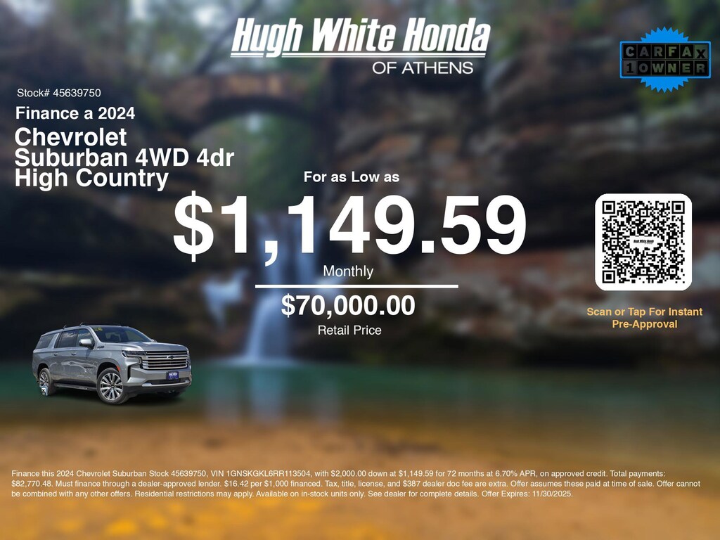 If you're ready to finance a quality used vehicle near Athens, Nelsonville, Logan, and Parkersburg, Hugh White Honda of Athens is thrilled to offer you a competitive finance offer on this 2024 Chevrolet Suburban 4WD 4dr High Country. Use our car payment calculator to estimate your monthly payments or see how the monthly payment of $1,149.59 is calculated for well-qualified buyers shopping at Hugh White Honda of Athens with Tier 1 credit: