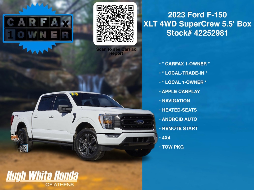 DESIRABLE FEATURES: * CARFAX 1-OWNER *, * LOCAL 1-OWNER *, * LOCAL-TRADE-IN *, NAVIGATION, APPLE CARPLAY, HEATED-SEATS, REMOTE START, 4X4, ANDROID AUTO, TOW PKG, RUNNING BOARDS, BED LINER, BLUETOOTH, BLIND-SPOT MONITORING, BACKUP CAMERA, BACKUP-SENSORS, FOG LAMPS, TONNEAU-COVER, WiFi Hotspot, Remote entry. Your 2023 Ford F-150 XLT 4WD SuperCrew 5.5' Box is perfect for daily work or weekend road trips to our neighboring communities of Athens.