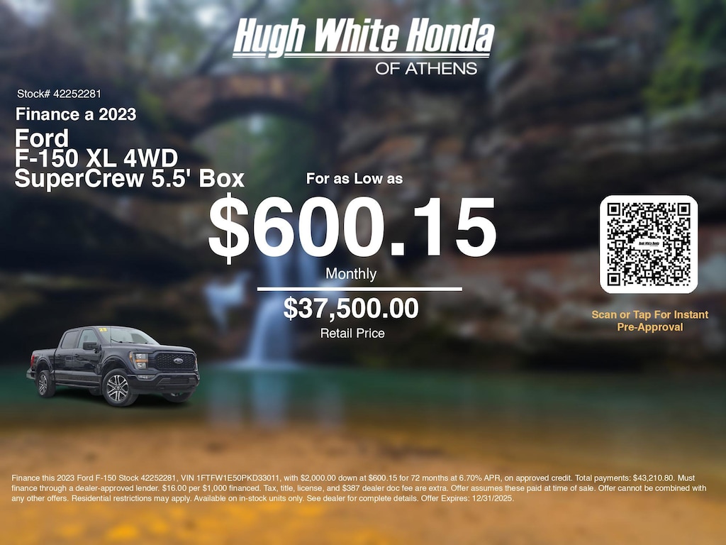 Our car loan payment calculator can help you calculate car payment options for this and other Honda finance offers that leverage the benefits of Honda Financial Services.@@ Call or drive in for Honda finance deals like this stunning 2023 Ford F-150 with finance options near Athens! Use our car monthly payment calculator to estimate your car payment, or try our car payment estimator to explore different loan terms. These Honda finance specials end 12/31/2025.