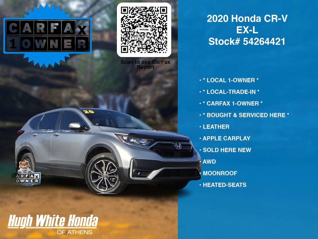 DESIRABLE FEATURES: * BOUGHT & SERVICED HERE *, * CARFAX 1-OWNER *, * LOCAL 1-OWNER *, * LOCAL-TRADE-IN *, LEATHER, SOLD HERE NEW, APPLE CARPLAY, AWD, MOONROOF, REMOTE START, LANE-DEPARTURE WARNING, TECH PKG, ANDROID AUTO, HEATED-SEATS, KEYLESS-START, TURBO, HANDS-FREE LIFTGATE, BLUETOOTH, POWER LIFT-GATE, BACKUP CAMERA, BLIND-SPOT MONITORING, HOMELINK, FOG LAMPS, ALLOY-WHEELS, MULTI-ZONE AC, Remote entry, SiriusXM. Your 2020 Honda CR-V EX-L is perfect for daily work or weekend road trips to our neighboring communities of Athens.