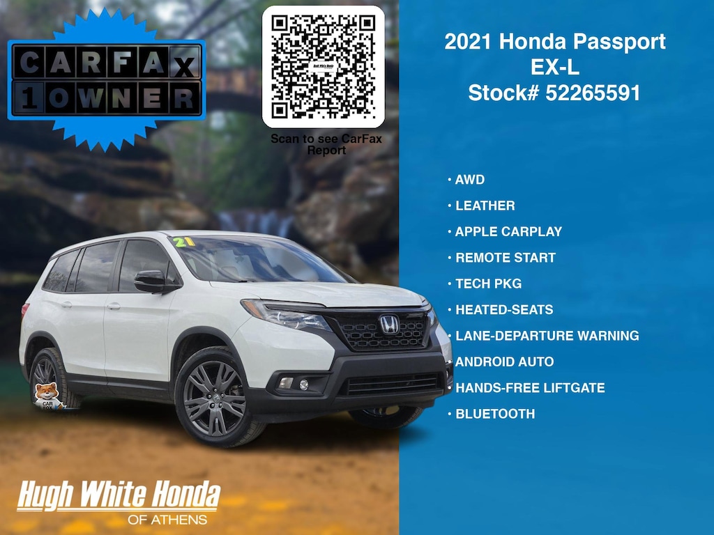 DESIRABLE FEATURES: AWD, LEATHER, APPLE CARPLAY, REMOTE START, TECH PKG, ANDROID AUTO, LANE-DEPARTURE WARNING, HEATED-SEATS, BACKUP CAMERA, HANDS-FREE LIFTGATE, BLIND-SPOT MONITORING, POWER LIFT-GATE, BLUETOOTH, FOG LAMPS, HOMELINK, MULTI-ZONE AC, ALLOY-WHEELS, Push-Button Start, SiriusXM, Remote entry. Your 2021 Honda Passport EX-L is perfect for daily work or weekend road trips to our neighboring communities of Athens.