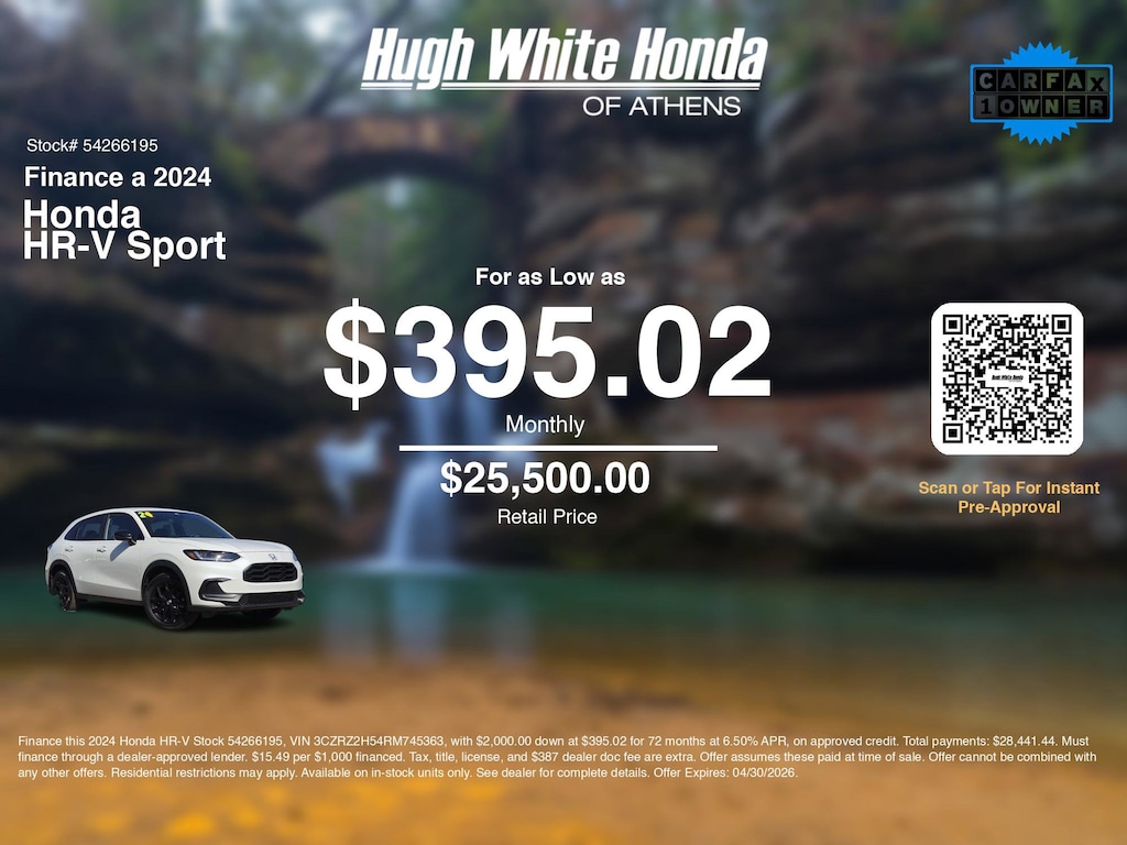 If you're ready to finance a quality used vehicle near Athens, Nelsonville, Logan, and Parkersburg, Hugh White Honda of Athens is thrilled to offer you a competitive finance offer on this 2024 Honda HR-V Sport. Use our car payment calculator to estimate your monthly payments or see how the monthly payment of $395.02 is calculated for well-qualified buyers shopping at Hugh White Honda of Athens with Tier 1 credit:
