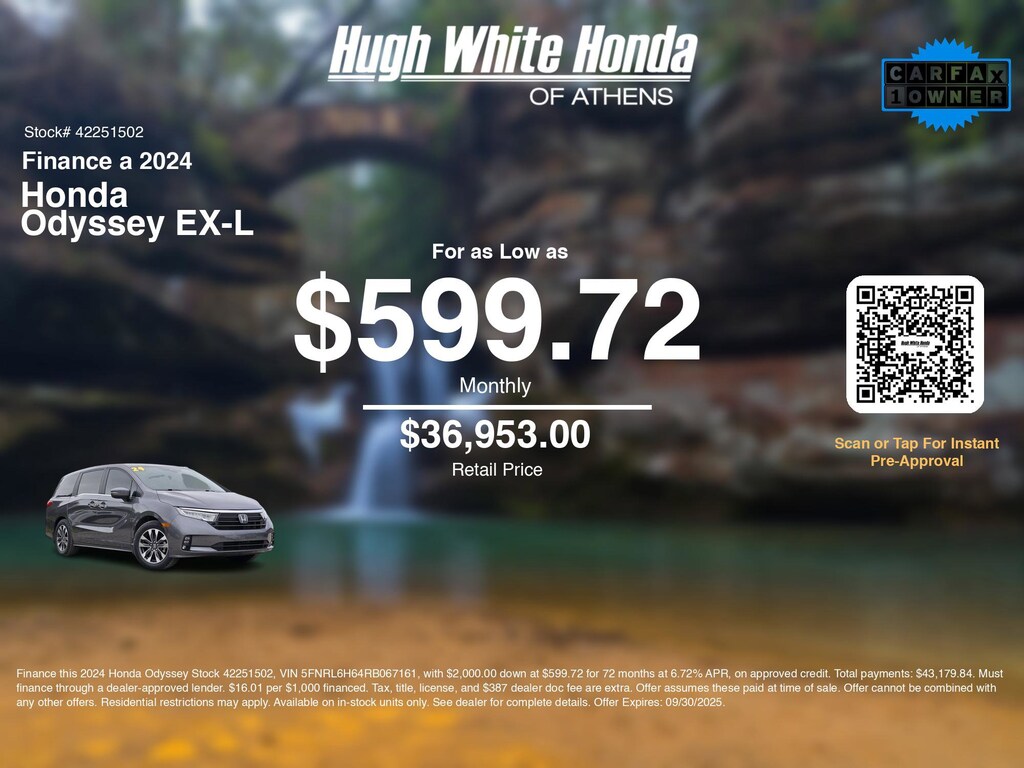 Disclaimer: Finance this 2024 Honda Odyssey Stock 42251502, VIN 5FNRL6H64RB067161, with $2,000.00 down at $585.27 for 72 months at 6.72% APR, on approved credit. Total payments: $42,139.44. Must finance through a dealer-approved lender. $15.99 per $1,000 financed. Tax, title, license, and $387 dealer doc fee are extra. Offer assumes these paid at time of sale. Offer cannot be combined with any other offers. Residential restrictions may apply. Available on in-stock units only. See dealer for complete details. Offer Expires: 10/31/2025.