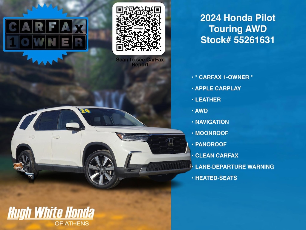 (844) 859-8630 TO SCHEDULE YOUR TEST DRIVE of this 2024 Honda Pilot Touring AWD. You can also visit us at 250 Columbus Road. Athens, OH 45701 to check it out in person! Our Hugh White Athens Used car dealership only sells used cars Athens, OH buyers can trust for safety and worry free driving.