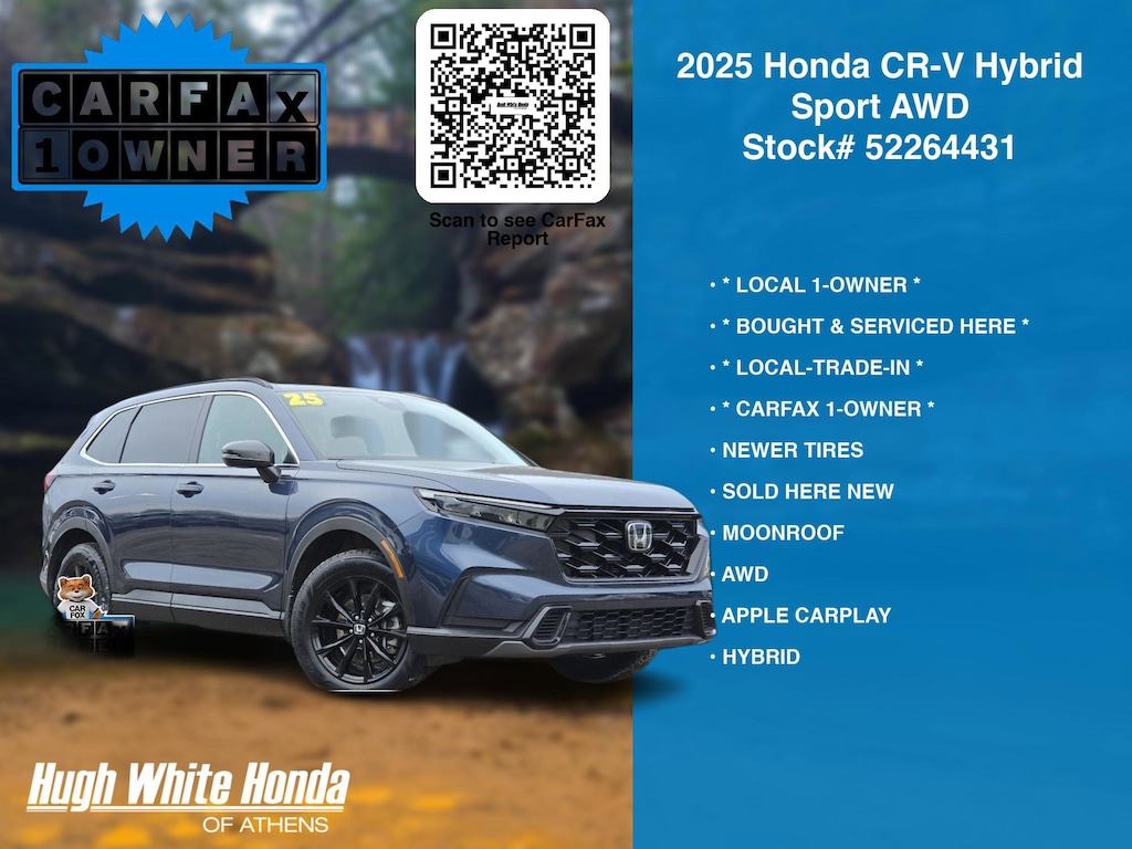 DESIRABLE FEATURES: * LOCAL-TRADE-IN *, * CARFAX 1-OWNER *, * LOCAL 1-OWNER *, * BOUGHT & SERVICED HERE *, APPLE CARPLAY, AWD, SOLD HERE NEW, MOONROOF, HYBRID, NEWER TIRES, HEATED-SEATS, REMOTE START, LANE-DEPARTURE WARNING, ANDROID AUTO, TECH PKG, KEYLESS-START, BLUETOOTH, BACKUP CAMERA, BLIND-SPOT MONITORING, ALLOY-WHEELS, MULTI-ZONE AC, Remote entry. Your 2025 Honda CR-V Hybrid Sport AWD is perfect for daily work or weekend road trips to our neighboring communities of Athens.