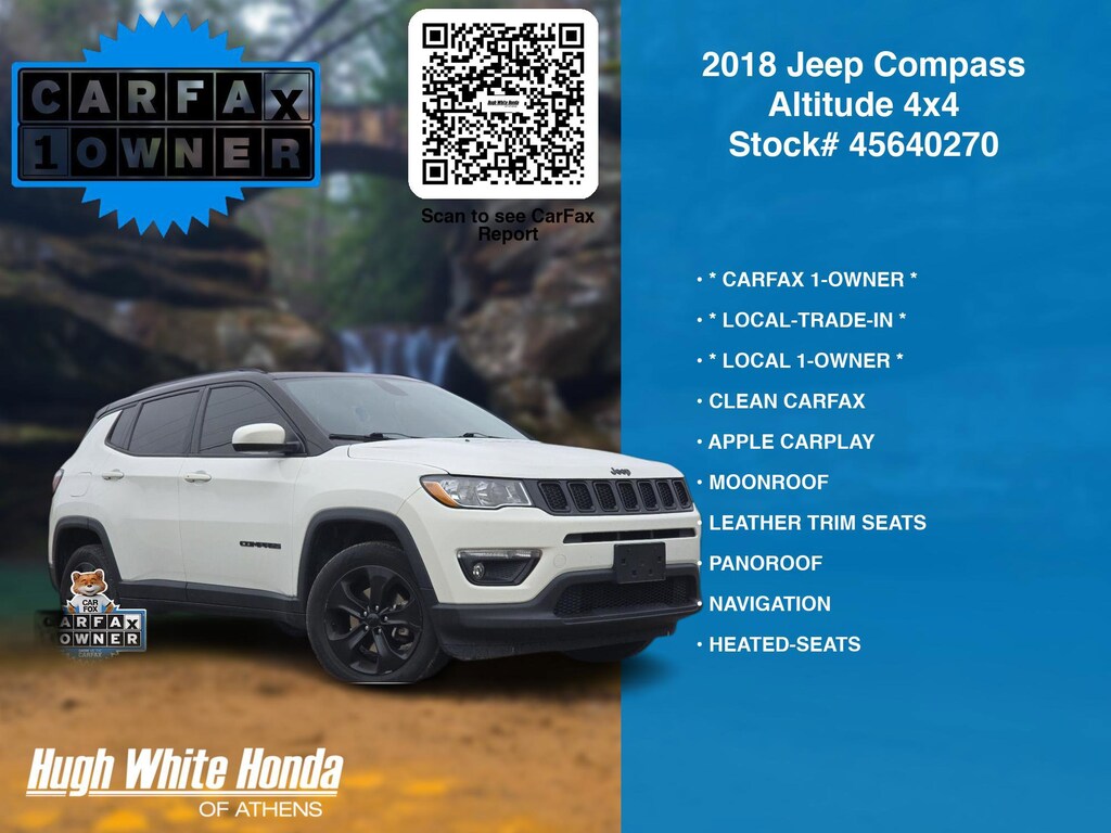 DESIRABLE FEATURES: * CARFAX 1-OWNER *, * LOCAL 1-OWNER *, * LOCAL-TRADE-IN *, NAVIGATION, MOONROOF, LEATHER TRIM SEATS, APPLE CARPLAY, PANOROOF, CLEAN CARFAX, 4X4, HEATED-SEATS, ANDROID AUTO, REMOTE START, KEYLESS-START, BEATS AUDIO, HEATED-STEERING WHEEL, POWER LIFT-GATE, HANDS-FREE LIFTGATE, BACKUP CAMERA, BLUETOOTH, FOG LAMPS, Remote entry. Your 2018 Jeep Compass Altitude 4x4 is perfect for daily work or weekend road trips to our neighboring communities of Athens.