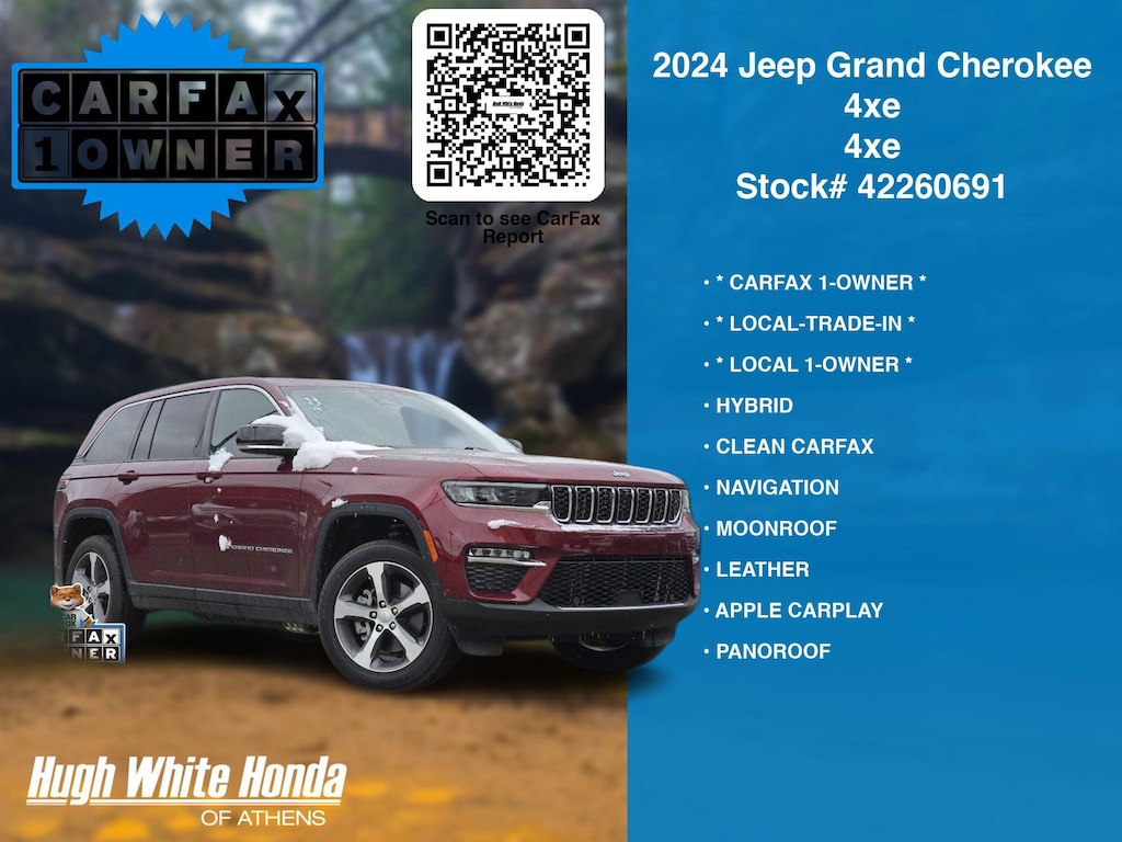 DESIRABLE FEATURES: * LOCAL-TRADE-IN *, * CARFAX 1-OWNER *, * LOCAL 1-OWNER *, NAVIGATION, PANOROOF, CLEAN CARFAX, APPLE CARPLAY, MOONROOF, LEATHER, HYBRID, HEATED-REAR SEATS, REMOTE START, LANE-DEPARTURE WARNING, 4X4, HEATED-SEATS, ANDROID AUTO, TECH PKG, COOLED SEATS, TURBO, PREMIUM AUDIO, HEATED-STEERING WHEEL, POWER LIFT-GATE, WIRELESS PHONE CHARGING, BACKUP CAMERA, BLIND-SPOT MONITORING, HANDS-FREE LIFTGATE, BLUETOOTH, BACKUP-SENSORS, ALLOY-WHEELS, MULTI-ZONE AC, FOG LAMPS, WiFi Hotspot, Push-Button Start, Remote entry, SiriusXM. Your 2024 Jeep Grand Cherokee 4xe 4xe is perfect for daily work or weekend road trips to our neighboring communities of Athens.