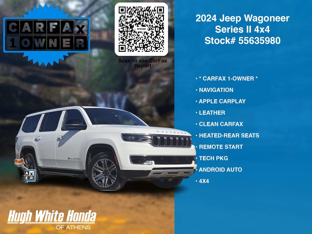 DESIRABLE FEATURES: * CARFAX 1-OWNER *, APPLE CARPLAY, NAVIGATION, LEATHER, CLEAN CARFAX, ANDROID AUTO, COOLED SEATS, HEATED-REAR SEATS, HEATED-SEATS, LANE-DEPARTURE WARNING, REMOTE START, 4X4, TECH PKG, TURBO, KEYLESS-START, PREMIUM AUDIO, 3RD ROW SEAT, HEATED-STEERING WHEEL, ALPINE AUDIO, BLUETOOTH, HANDS-FREE LIFTGATE, BLIND-SPOT MONITORING, RUNNING BOARDS, POWER LIFT-GATE, BACKUP CAMERA, FOG LAMPS, MULTI-ZONE AC, BACKUP-SENSORS, WiFi Hotspot, Remote entry, SiriusXM. Your 2024 Jeep Wagoneer Series II 4x4 is perfect for daily work or weekend road trips to our neighboring communities of Athens.