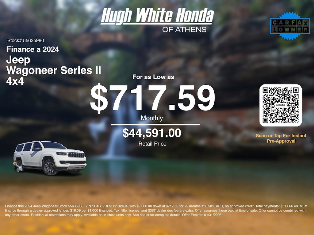 If you're ready to finance a quality used vehicle near Athens, Nelsonville, Logan, and Parkersburg, Hugh White Honda of Athens is thrilled to offer you a competitive finance offer on this 2024 Jeep Wagoneer Series II 4x4. Use our car payment calculator to estimate your monthly payments or see how the monthly payment of $717.59 is calculated for well-qualified buyers shopping at Hugh White Honda of Athens with Tier 1 credit: