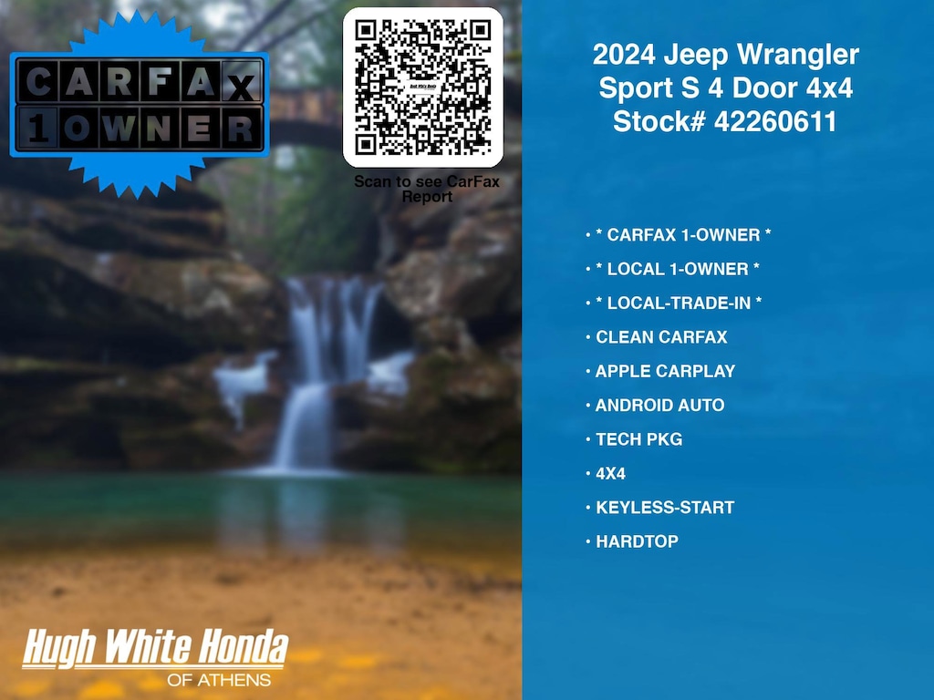 DESIRABLE FEATURES: * LOCAL-TRADE-IN *, * LOCAL 1-OWNER *, * CARFAX 1-OWNER *, CLEAN CARFAX, APPLE CARPLAY, 4X4, TECH PKG, ANDROID AUTO, KEYLESS-START, BLUETOOTH, HARDTOP, BACKUP CAMERA, FOG LAMPS, WiFi Hotspot. Your 2024 Jeep Wrangler Sport S 4 Door 4x4 is perfect for daily work or weekend road trips to our neighboring communities of Athens.