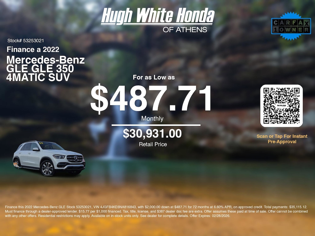 If you're ready to finance a quality used vehicle near Athens, Nelsonville, Logan, and Parkersburg, Hugh White Honda of Athens is thrilled to offer you a competitive finance offer on this 2022 Mercedes-Benz GLE GLE 350 4MATIC SUV. Use our car payment calculator to estimate your monthly payments or see how the monthly payment of $487.71 is calculated for well-qualified buyers shopping at Hugh White Honda of Athens with Tier 1 credit:
