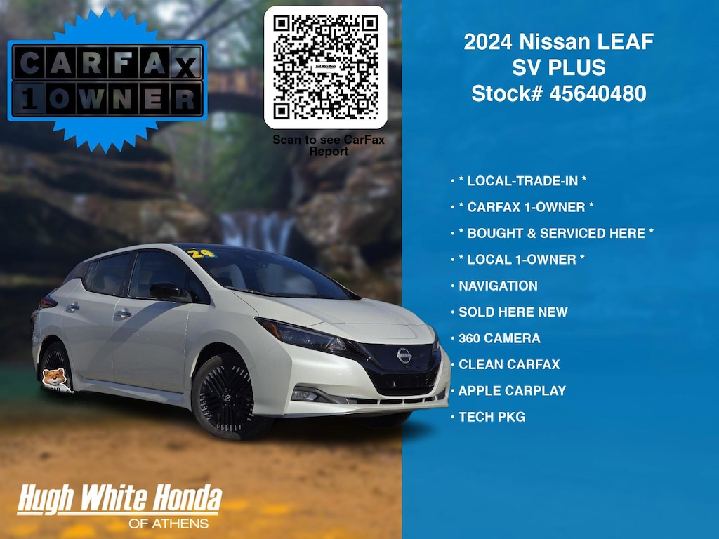 CARFAX VERIFIED 1-OWNER. Free CARFAX report! DESIRABLE FEATURES: * LOCAL 1-OWNER *, * CARFAX 1-OWNER *, * BOUGHT & SERVICED HERE *, * LOCAL-TRADE-IN *, SOLD HERE NEW, CLEAN CARFAX, 360 CAMERA, NAVIGATION, APPLE CARPLAY, LANE-DEPARTURE WARNING, HEATED-SEATS, TECH PKG, ANDROID AUTO, KEYLESS-START, HEATED-STEERING WHEEL, BACKUP CAMERA, BLIND-SPOT MONITORING, BLUETOOTH, FOG LAMPS, ALLOY-WHEELS, BACKUP-SENSORS, SiriusXM, Remote entry. Your 2024 Nissan LEAF SV PLUS is perfect for daily work or weekend road trips to our neighboring communities of Athens.