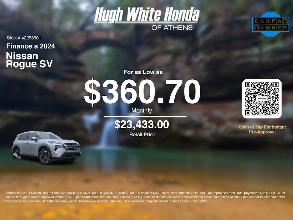 If you're ready to finance a quality used vehicle near Athens, Nelsonville, Logan, and Parkersburg, Hugh White Honda of Athens is thrilled to offer you a competitive finance offer on this 2024 Nissan Rogue SV. Use our car payment calculator to estimate your monthly payments or see how the monthly payment of $360.70 is calculated for well-qualified buyers shopping at Hugh White Honda of Athens with Tier 1 credit:
