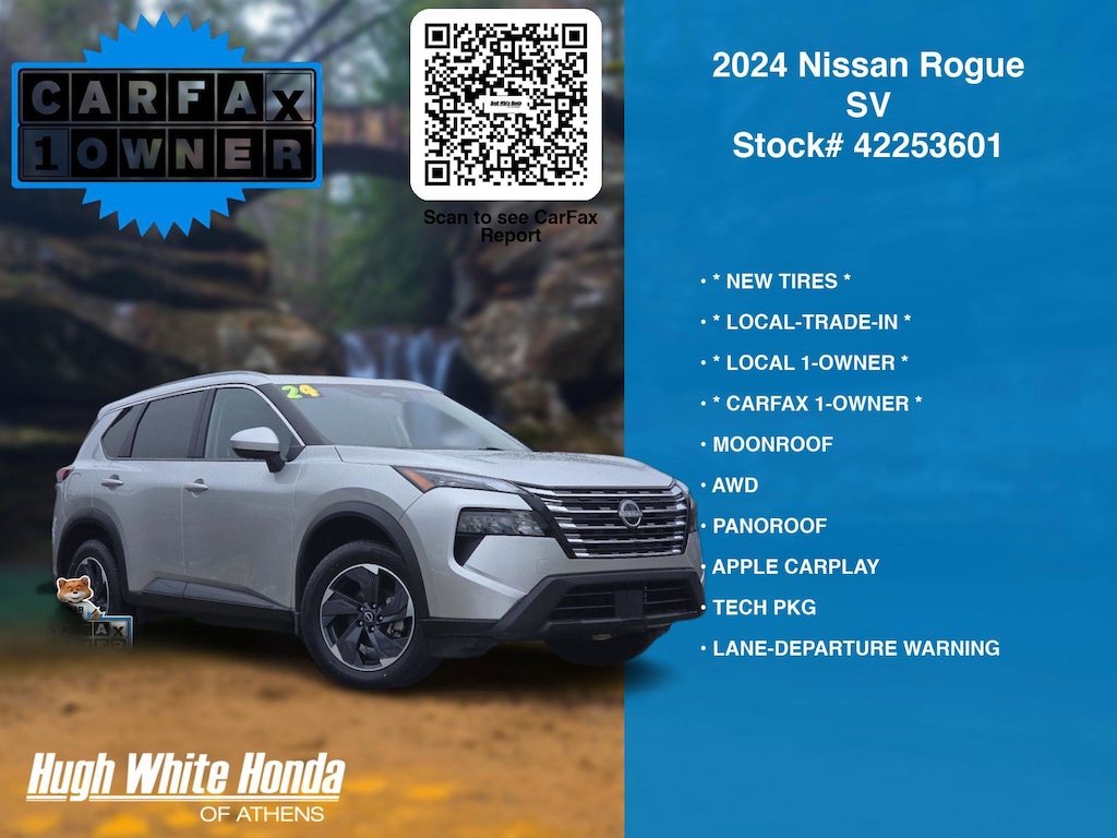 DESIRABLE FEATURES: * CARFAX 1-OWNER *, * NEW TIRES *, * LOCAL-TRADE-IN *, * LOCAL 1-OWNER *, APPLE CARPLAY, AWD, MOONROOF, PANOROOF, HEATED-SEATS, TECH PKG, REMOTE START, LANE-DEPARTURE WARNING, ANDROID AUTO, TURBO, KEYLESS-START, BLIND-SPOT MONITORING, HANDS-FREE LIFTGATE, BLUETOOTH, BACKUP CAMERA, POWER LIFT-GATE, ALLOY-WHEELS, BACKUP-SENSORS, MULTI-ZONE AC, WiFi Hotspot, Remote entry, SiriusXM. Your 2024 Nissan Rogue SV is perfect for daily work or weekend road trips to our neighboring communities of Athens.