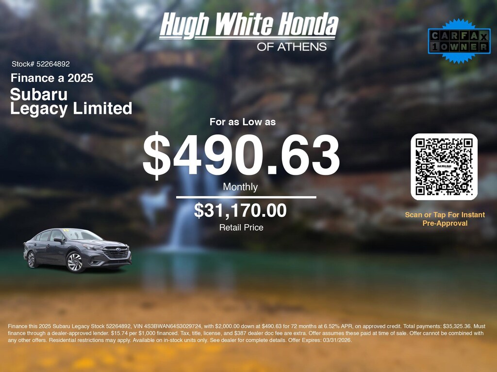 If you're ready to finance a quality used vehicle near Athens, Nelsonville, Logan, and Parkersburg, Hugh White Honda of Athens is thrilled to offer you a competitive finance offer on this 2025 Subaru Legacy Limited. Use our car payment calculator to estimate your monthly payments or see how the monthly payment of $490.63 is calculated for well-qualified buyers shopping at Hugh White Honda of Athens with Tier 1 credit: