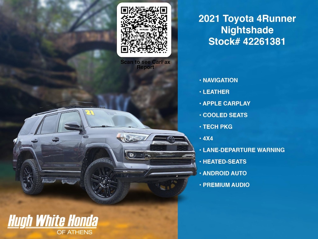 (844) 859-8630 TO SCHEDULE YOUR TEST DRIVE of this 2021 Toyota 4Runner Nightshade. You can also visit us at 250 Columbus Road. Athens, OH 45701 to check it out in person! Our Hugh White Athens Used car dealership only sells used cars Athens, OH buyers can trust for safety and worry free driving.