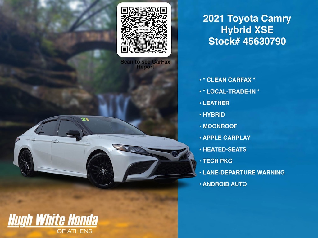 DESIRABLE FEATURES: * LOCAL-TRADE-IN *, CLEAN CARFAX, HYBRID, APPLE CARPLAY, MOONROOF, LEATHER, TECH PKG, ANDROID AUTO, HEATED-SEATS, LANE-DEPARTURE WARNING, BLIND-SPOT MONITORING, BLUETOOTH, BACKUP CAMERA, HOMELINK, MULTI-ZONE AC, ALLOY-WHEELS, WiFi Hotspot, Push-Button Start, SiriusXM, Remote entry. Your 2021 Toyota Camry Hybrid XSE is perfect for daily work or weekend road trips to our neighboring communities of Athens.